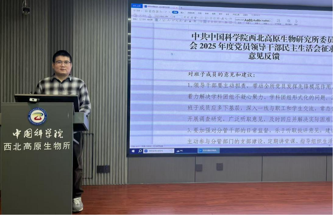 組織委員劉博向全體參會(huì)人員通報(bào)《中共中國(guó)科學(xué)院西北高原生物研究所委員會(huì)2025年度黨員領(lǐng)導(dǎo)干部民主生活會(huì)征求意見反饋》的情況。預(yù)備黨員唐有林,發(fā)展對(duì)象盧露、孟頤新、李霞、李子雁,入黨積極分子吳玥、宋枚汐依次匯報(bào)了本季度思想動(dòng)態(tài)、學(xué)習(xí)進(jìn)展及工作成效。