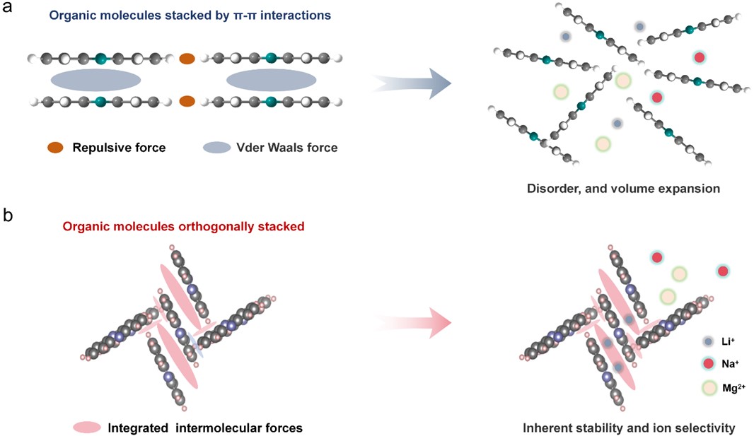 針對(duì)高容量有機(jī)小分子電極因離子插層體積膨脹導(dǎo)致結(jié)構(gòu)坍塌失穩(wěn)的科學(xué)挑戰(zhàn),研究團(tuán)隊(duì)開(kāi)創(chuàng)性地提出基于分子間作用力網(wǎng)絡(luò)構(gòu)筑穩(wěn)定晶體結(jié)構(gòu)的新思路。以吩嗪為模型體系,研究證實(shí)正交垂直的分子堆疊方式可形成強(qiáng)分子間作用力網(wǎng)絡(luò)和具有離子選擇性的納米孔道。該結(jié)構(gòu)不僅能有效抑制體積膨脹帶來(lái)的機(jī)械失效問(wèn)題,同時(shí)其產(chǎn)生的親鋰孔道在原子尺度對(duì)單價(jià)金屬離子(Li)具有優(yōu)先傳輸與選擇性性能,選擇性提鋰容量高達(dá)109 mg/g。該工作原創(chuàng)性地揭示了分子堆疊微結(jié)構(gòu)與電極材料的宏觀電化學(xué)穩(wěn)定性和離子選擇性之間的內(nèi)在物理化學(xué)規(guī)律,為設(shè)計(jì)新一代兼具高穩(wěn)定性、高選擇性、高通量的有機(jī)電化學(xué)離子捕獲材料奠定了重要理論基礎(chǔ)。
