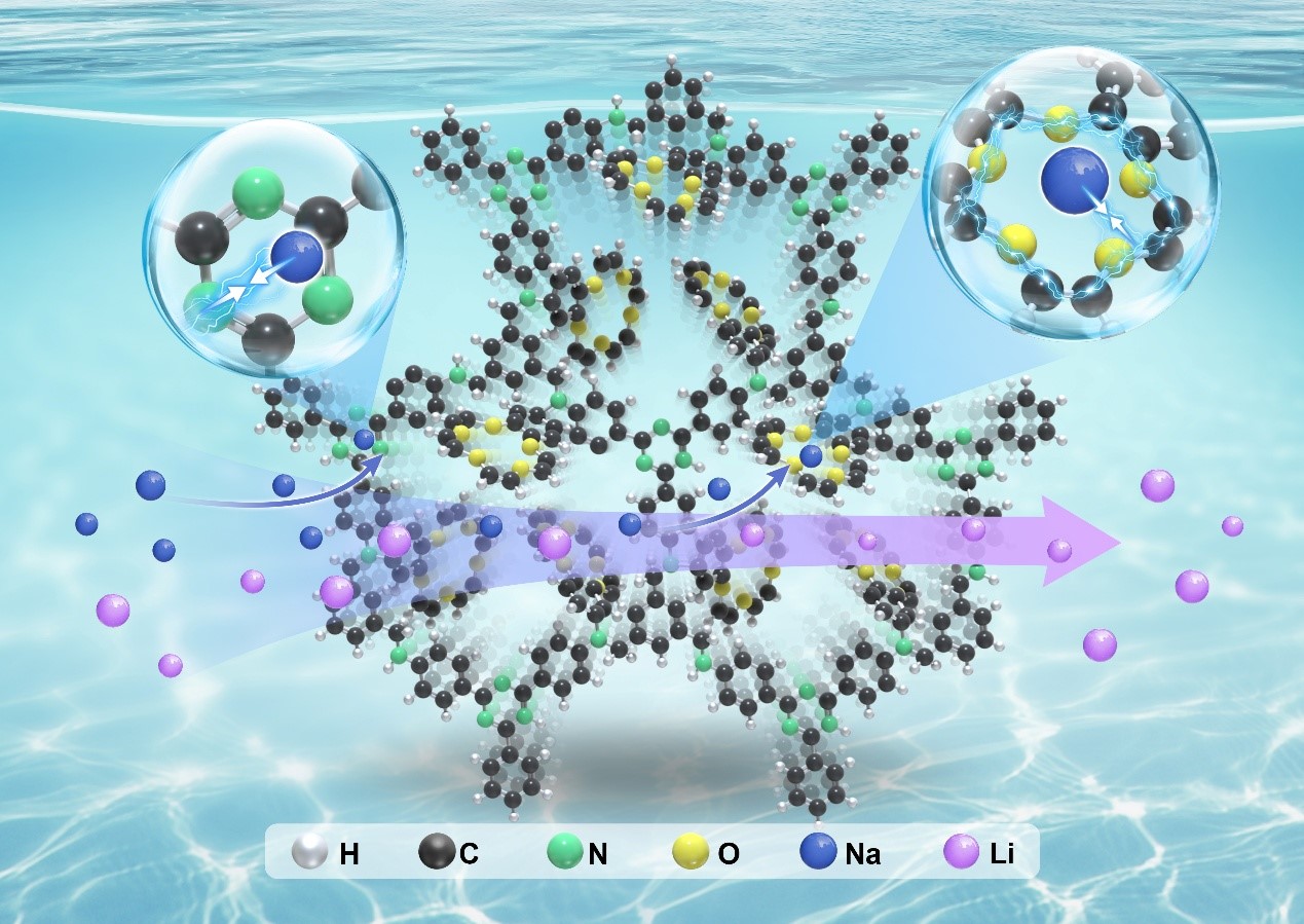 近日,青海鹽湖所膜分離提鋰技術(shù)與應(yīng)用團隊和電化學(xué)分離技術(shù)團隊在Chemical Engineering Journal期刊上發(fā)表題為“Synergy of framework dynamics and crown ether chemistry in covalent organic frameworks for Na+ capture(共價有機框架中框架動力學(xué)與冠醚化學(xué)的協(xié)同效應(yīng)助力鈉離子捕獲)”的研究進(jìn)展,青海鹽湖所博士生何小祥為論文第一作者,膜分離提鋰技術(shù)與應(yīng)用團隊的朱朝梁副研究員、徐國旺博士和電化學(xué)分離技術(shù)團隊的高丹丹研究員為共同通訊作者。在這項工作中,科研人員開發(fā)了一種新的柔性COFs的合成策略,在水溶液中通邊攪拌單體90分鐘內(nèi)合成了ISL-COF-1和ISL-COF-2,并通過后合成修飾柔性COFs制備了4-溴苯并-15-冠-5功能化的COFs(ISL-COF-1CE/2CE)。表征結(jié)果表明,修飾后的COFs在保持高結(jié)晶度的同時,實現(xiàn)了15C5的有效固定。其中,ISL-COF-1CE展現(xiàn)出顯著的Na?吸附性能(63.7 mg/g),優(yōu)異的選擇性吸附(Na?:41.4 mg/g vs Li?:5.8 mg/g)和循環(huán)穩(wěn)定性(10次循環(huán)后效率>90%),證明了在Na?吸附方面的卓越性能。動力學(xué)和熱力學(xué)分析表明,吸附過程符合偽二階模型和朗格繆爾等溫線,且為吸熱自發(fā)反應(yīng)。DFT計算揭示冠醚位點為主要結(jié)合位點,其次為三嗪N,而C–NH基團作用較弱。實驗分析和理論計算表明,ISL-COF-1CE在Na?吸附方面的卓越性能源于冠醚配位、柔性框架、靜電相互作用與親水性增強的協(xié)同效應(yīng)。該研究不僅闡明了冠醚-COFs中主-客體的相互作用機制,還為開發(fā)高效離子分離吸附劑提供了新策略。