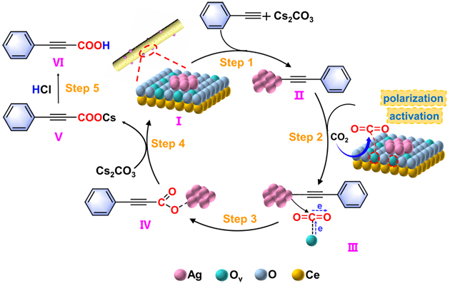 基于上述研究,對反應機理做出了闡釋(見圖2),在Cs2CO3的協(xié)助下,苯乙炔中的酸性C(sp)-H鍵被去質子化,形成末端炔基陰離子,同時與銀簇(Ag+)配位,生成銀炔中間體(II);CO2在CeO2表面的Ov位點上吸附并發(fā)生極化,通過對炔基的親電攻擊(III),活化的CO2插入到 C≡C---Ag 鍵中,生成羧酸銀中間體(IV),隨后用鹽酸酸化獲得產物苯丙炔酸(V-VI)。