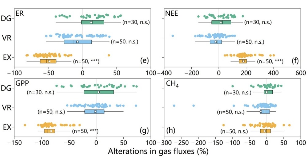 研究表明,熱融滑塌顯著削弱了高寒草地的碳匯功能。與未擾動(dòng)區(qū)域相比,在植被被剝蝕的裸露地表,生態(tài)系統(tǒng)呼吸降低了49%,而總初級(jí)生產(chǎn)力則下降82%,導(dǎo)致凈生態(tài)系統(tǒng)交換增加181%,由碳匯完全轉(zhuǎn)變?yōu)樘荚?。雖然裸露地表表現(xiàn)出持續(xù)的CH4吸收,但其吸收量級(jí)遠(yuǎn)不足以抵消額外排放的CO2。