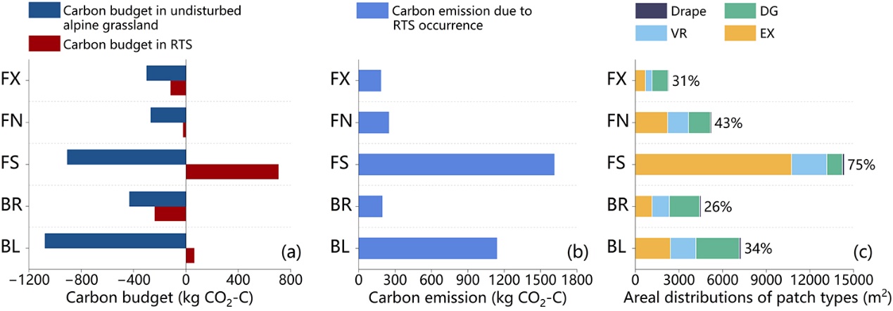 青藏高原是全球最大的高海拔多年凍土區(qū),儲(chǔ)存著大量土壤有機(jī)碳。近年來,隨著氣候變暖、多年凍土廣泛退化,熱融滑塌、熱融溝和熱融湖塘等反映多年凍土快速融化現(xiàn)象的熱喀斯特地貌廣泛發(fā)育,其對(duì)高寒生態(tài)系統(tǒng)碳循環(huán)和氣候反饋的影響備受關(guān)注。然而,與熱融溝和熱融湖塘相比,無論是青藏高原還是環(huán)北極多年凍土區(qū),熱融滑塌(retrogressive thaw slumps,RTS)對(duì)凍土生態(tài)系統(tǒng)碳動(dòng)態(tài)的影響都缺乏系統(tǒng)性研究。