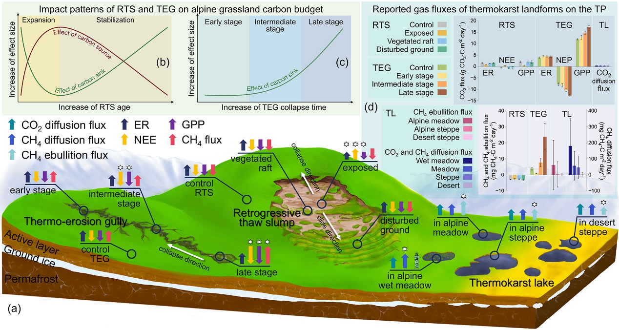 中國科學(xué)院西北生態(tài)環(huán)境資源研究院冰凍圈科學(xué)與凍土工程全國重點(diǎn)實(shí)驗(yàn)室研究團(tuán)隊(duì)聯(lián)合蘭州大學(xué)、丹麥哥本哈根大學(xué)以及中國科學(xué)院植物研究所,于2024和2025年在青藏高原腹地開展系統(tǒng)性溫室氣體通量觀測(cè),量化了熱融滑塌所導(dǎo)致的通量變化以及研究區(qū)域的碳收支平衡,為評(píng)估氣候變化背景下青藏高原多年凍土碳反饋提供了關(guān)鍵證據(jù)。