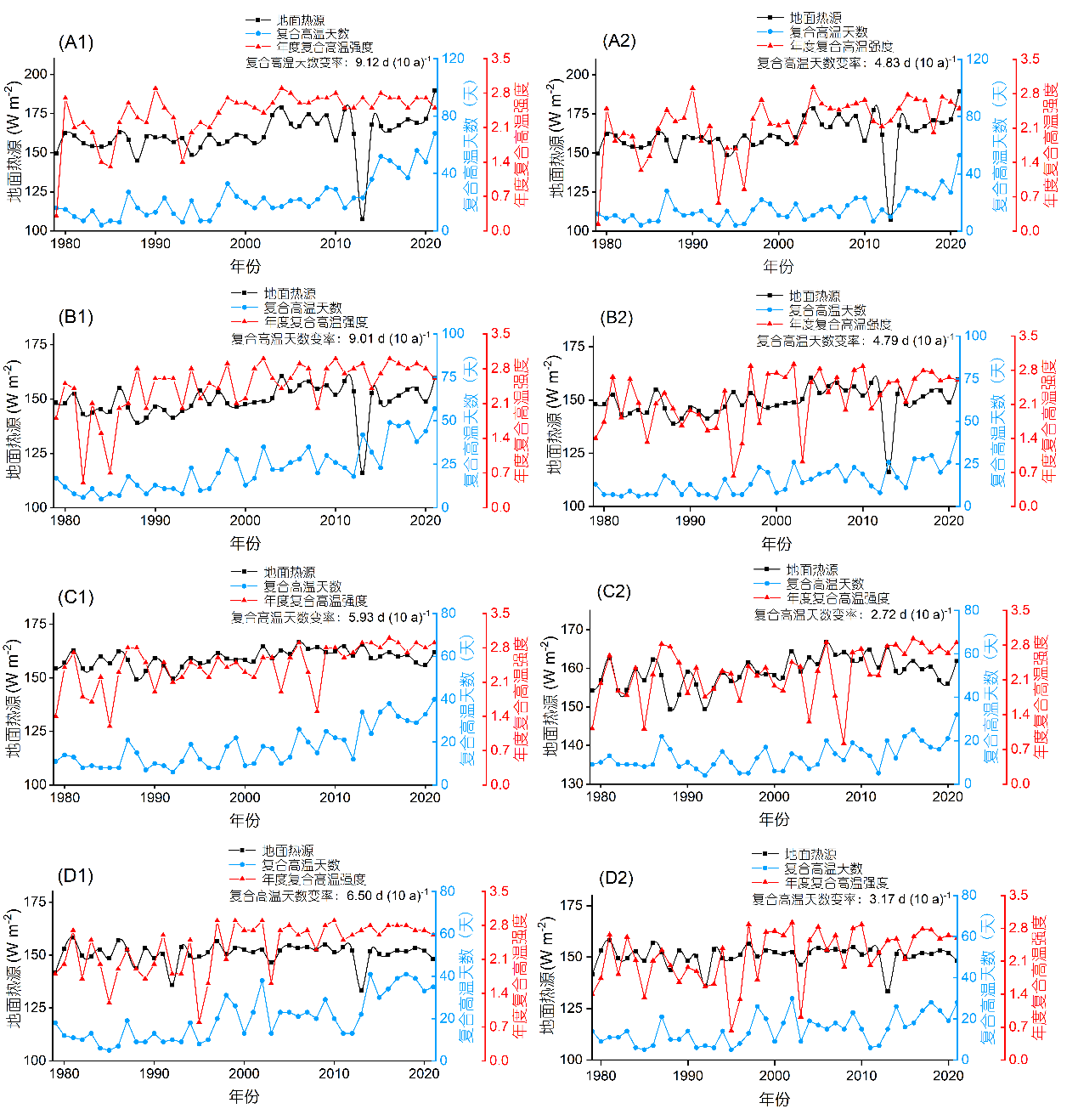 1979–2021年4個城市群地面熱源、復(fù)合高溫天數(shù)和年度復(fù)合高溫強(qiáng)度的年際變化。(A) 珠江三角洲;(B) 長江三角洲;(C) 成渝地區(qū);(D) 京津冀地區(qū)。1:基準(zhǔn)期1981–2010年;2:基準(zhǔn)期1991–2020年