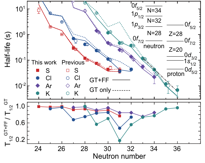 圖2:上圖:豐中子S、Cl、Ar和K同位素的β衰變半衰期系統(tǒng)性。實心符號表示本次實驗的測量值,空心符號為文獻(xiàn)值。實線和虛線分別展示了同時包含GT和FF躍遷以及僅考慮GT躍遷的殼模型理論半衰期。黑色點劃線用以突出54K35半衰期的偏離系統(tǒng)性下降。相關(guān)的中子、質(zhì)子軌道顯示在了右上角。下圖:包含F(xiàn)F和GT躍遷的理論半衰期與僅考慮GT躍遷的理論半衰期之比