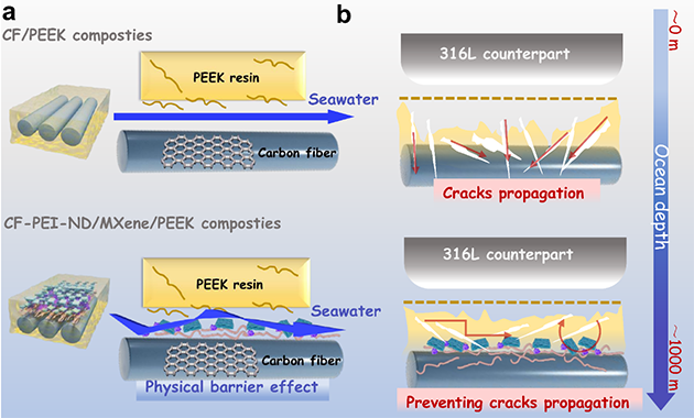 圖5.模擬深海環(huán)境下CF/PEEK復(fù)合材料增強(qiáng)潤滑機(jī)制及強(qiáng)韌界面機(jī)制示意圖