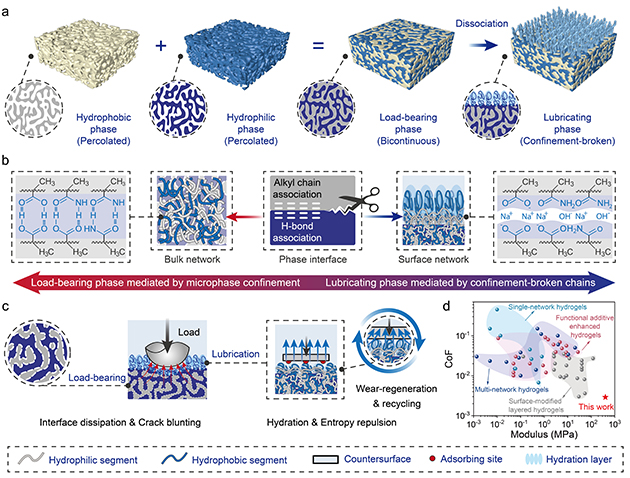 在人體關(guān)節(jié)中,軟骨依托多尺度膠原網(wǎng)絡(luò)、多相組分及其界面的協(xié)同作用,構(gòu)建出兼具高承載與超低摩擦的天然潤(rùn)滑系統(tǒng)?;谶@一特性,水凝膠作為有潛力的人工軟骨替代材料備受關(guān)注。然而,傳統(tǒng)潤(rùn)滑水凝膠往往因結(jié)構(gòu)均一性而陷入兩難境地,提高整體網(wǎng)絡(luò)致密度雖能增強(qiáng)力學(xué)性能,卻會(huì)削弱表面水合與潤(rùn)滑能力;單純追求低摩擦,又會(huì)使材料在高載荷下迅速變形、蠕變甚至失效。這種長(zhǎng)期存在的性能權(quán)衡,嚴(yán)重制約了水凝膠在高載荷、長(zhǎng)壽命潤(rùn)滑場(chǎng)景中的實(shí)際應(yīng)用。