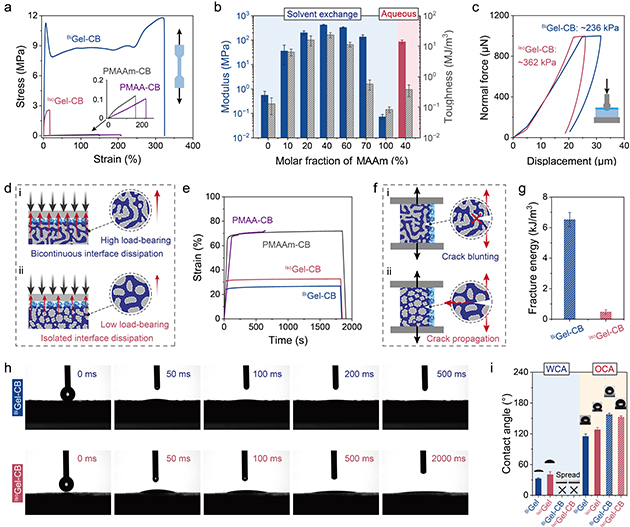 圖3. (a) 不同水凝膠的單軸拉伸應(yīng)力-應(yīng)變曲線。(b) 楊氏模量和韌性與MAAm含量的關(guān)系。(c) 表面納米壓痕測(cè)試曲線。(d) 抗蠕變性能測(cè)試示意圖及(e)蠕變曲線。(f) 純剪切測(cè)試示意圖及(g)斷裂能結(jié)果。(h) 水滴在BiGel-CB和IsoGel-CB表面的動(dòng)態(tài)鋪展過程。(i)?超親水及水下超疏油性能評(píng)估。