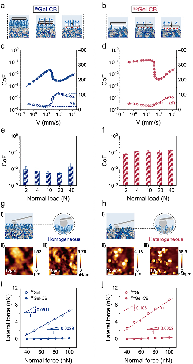 圖4.(a)?BiGel-CB和(b)?IsoGel-CB的潤(rùn)滑機(jī)制示意圖。(c, d)?BiGel-CB和IsoGel-CB的Stribeck曲線及相應(yīng)水合高度變化。(e, f) 在邊界潤(rùn)滑狀態(tài)下,摩擦系數(shù)隨載荷的變化。(g, h)?BiGel-CB和IsoGel-CB表面的AFM高度圖。(k, l) 利用LFM測(cè)得的側(cè)向力-法向力曲線及計(jì)算得出的微觀摩擦系數(shù)。