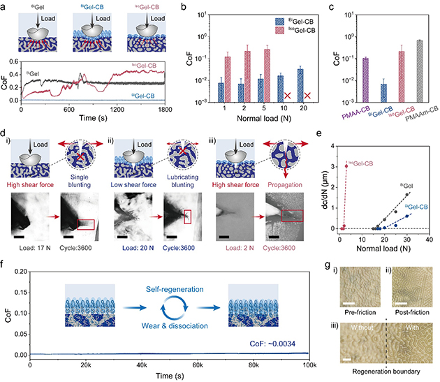 圖5.(a) 摩擦測(cè)試示意圖及BiGel、BiGel-CB和IsoGel-CB對(duì)應(yīng)的摩擦系數(shù)曲線。(b)?BiGel-CB和IsoGel-CB摩擦系數(shù)隨載荷的變化。(c) PMAA-CB、BiGel-CB、PMAAm-CB和IsoGel-CB樣品的平均摩擦系數(shù)。(d) 摩擦裂紋擴(kuò)展示意圖及 i)?BiGel, ii)?BiGel-CB, iii)?IsoGel-CB的裂紋光學(xué)圖像(比例尺:200 μm)。(e)?BiGel、BiGel-CB和IsoGel-CB的界面裂紋擴(kuò)展速率隨載荷的變化。(f)?BiGel-CB在50 N法向載荷下的長(zhǎng)期潤(rùn)滑性能。(g)?BiGel-CB在PBS溶液中摩擦測(cè)試前后的表面光學(xué)圖像:i) 摩擦前,ii) 摩擦后,iii) 摩擦邊界(比例尺:200 μm)。