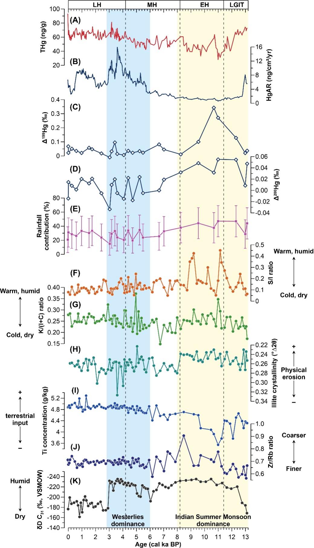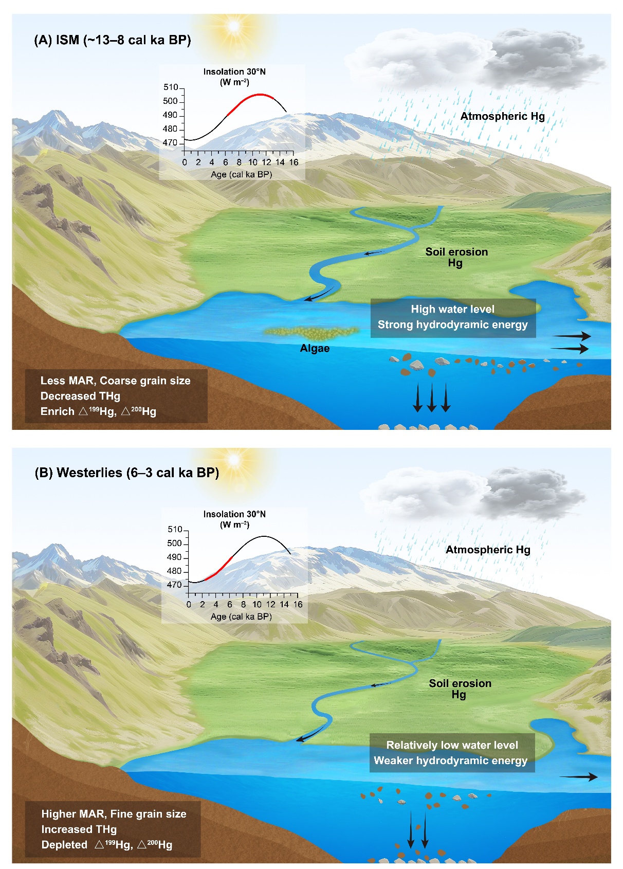 研究發(fā)現(xiàn),錯那湖沉積物中的汞主要來源于大氣降水輸入和流域剝蝕輸入。早全新世時期(~13–8 ka BP),印度夏季風(fēng)強盛,降水輸入貢獻率相對更高,占比達41 ± 7%,但總汞濃度(52.03 ± 12.74 ng/g)和沉積速率(1.94 ± 1.67 ng/c㎡/yr)均處于較低水平。進入中晚全新世時期(6–3 ka BP),隨著印度夏季風(fēng)減弱、西風(fēng)影響增強,降水輸入貢獻比降至26 ± 7%,而汞沉積速率則大幅提升至8.33 ± 3.08 ng/c㎡/yr,較早全新世時期顯著增高。