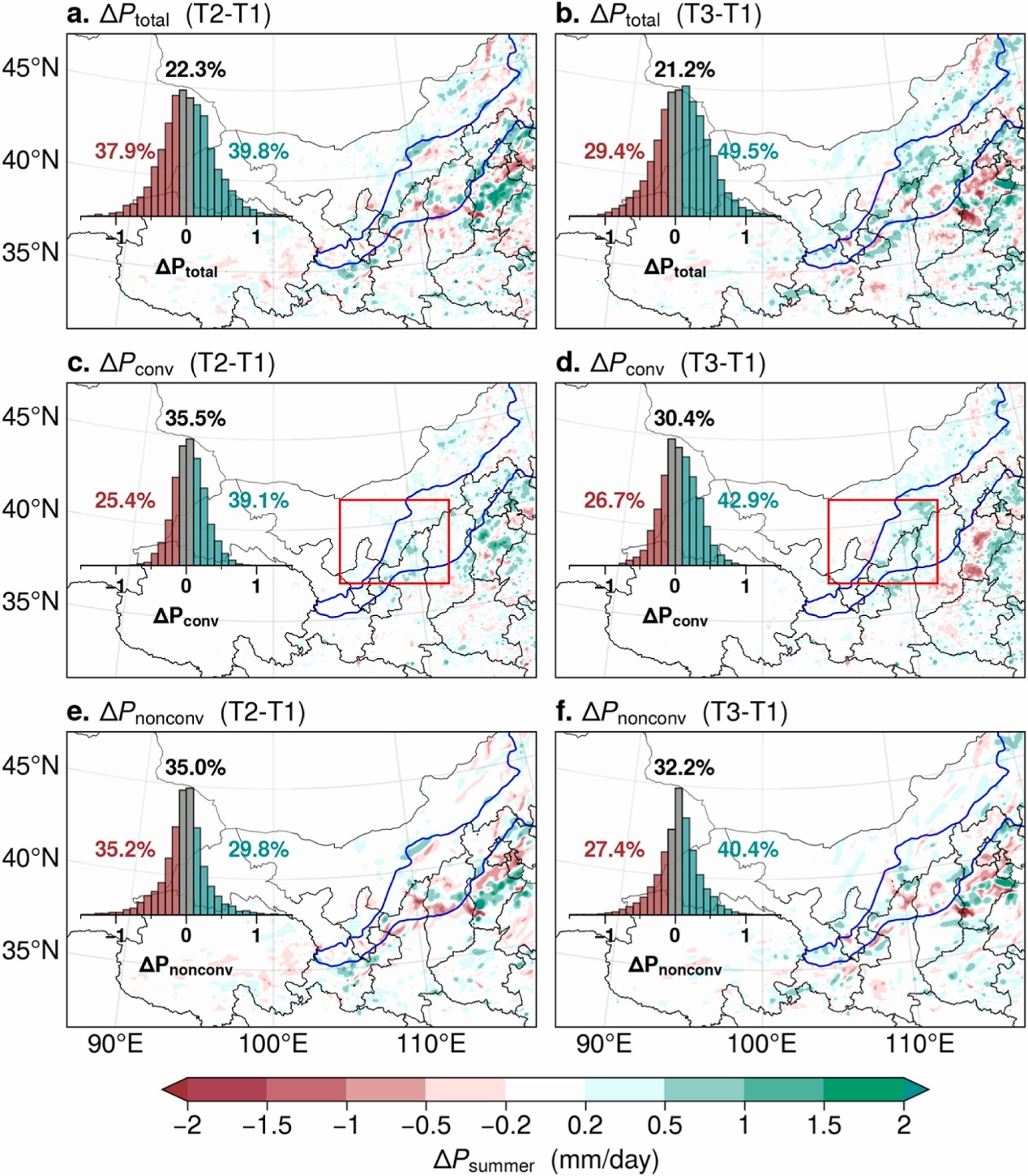 大規(guī)模風(fēng)電場(chǎng)群對(duì)夏季(a, b)總降水量、(c, d)對(duì)流性降水量及(e, f)非對(duì)流性降水量的影響