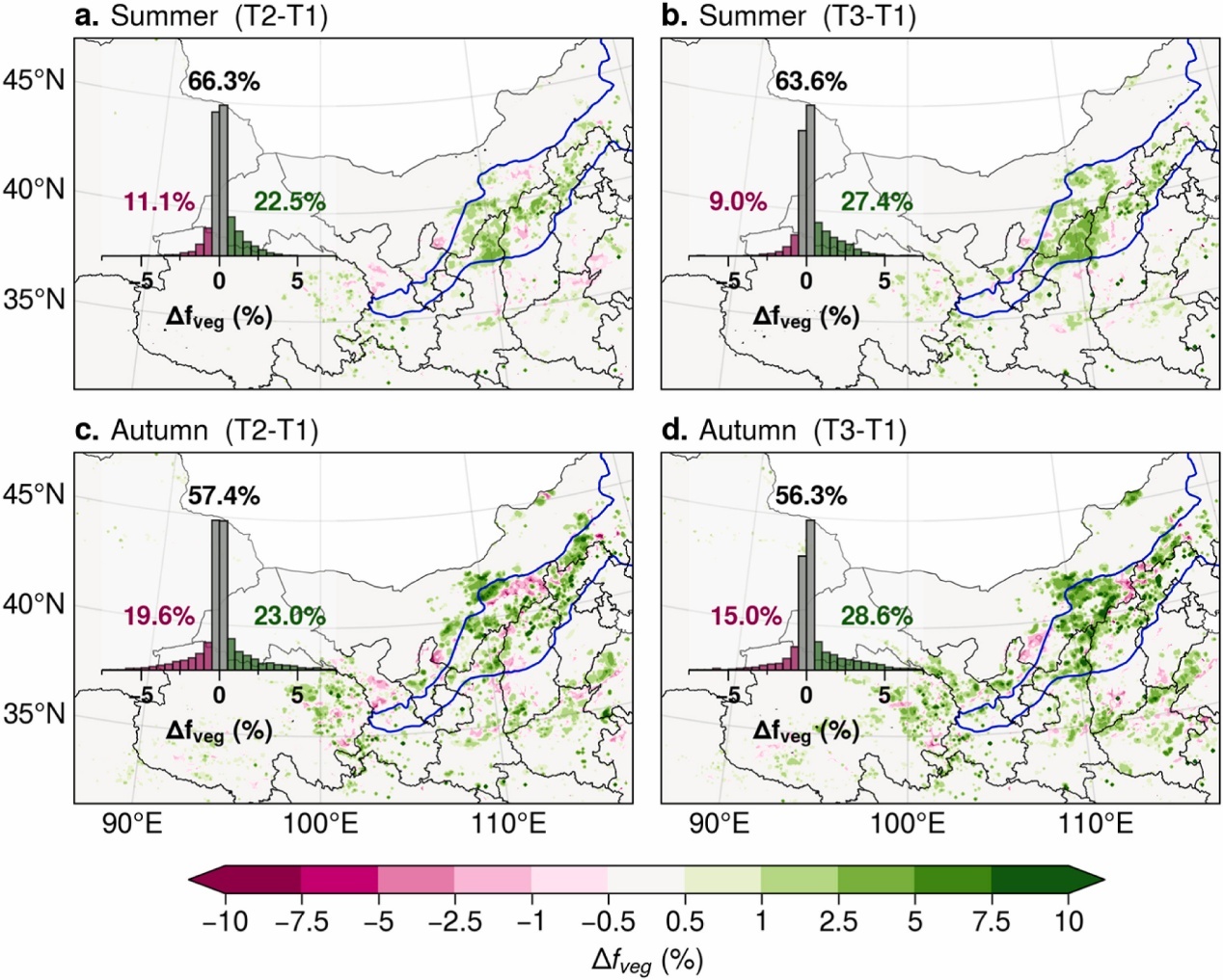 大規(guī)模風(fēng)電場(chǎng)群建設(shè)前后植被覆蓋度差異的空間分布(a, b)夏季,(c, d)秋季