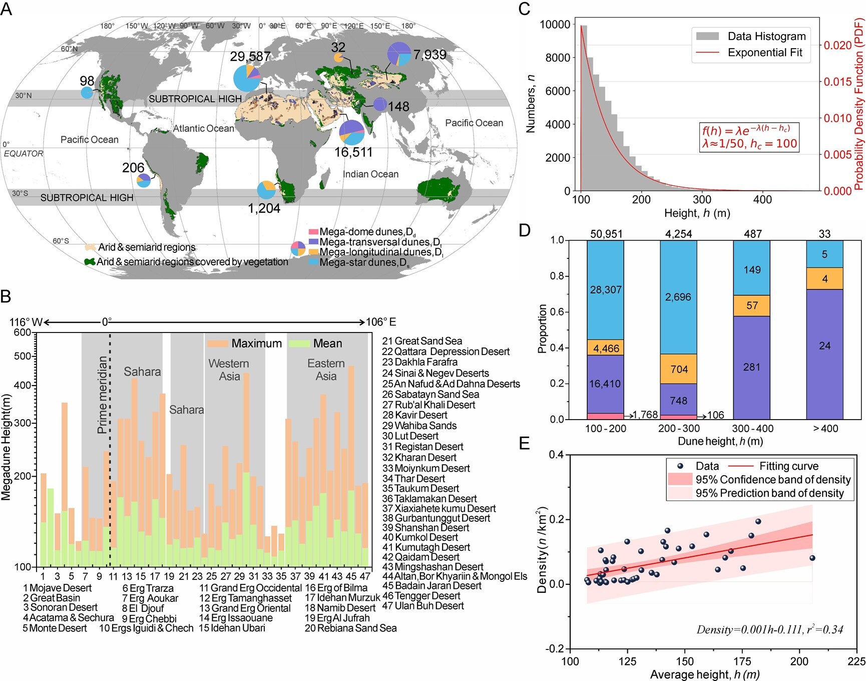 研究發(fā)現(xiàn),全球97%以上高大沙山集中于撒哈拉沙漠與亞洲干旱區(qū),充足沙源與強(qiáng)勁風(fēng)力是沙山發(fā)育的基礎(chǔ)條件;澳大利亞沙漠因植被覆蓋度高、輸沙量有限,而未發(fā)育沙山。全球近91%的沙山高度介于100–200米,且以星狀沙山為主,表明多向風(fēng)況更利于沙山的形成;高度超300米后以橫向沙山為主,超過400米的沙山僅有33座??臻g上,大陸內(nèi)部沙丘場(chǎng)沙山平均高度更高且沙山密度隨沙山平均高度升高而顯著增加。