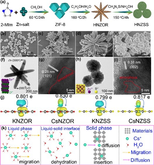 基于上述策略,將十二面體ZIF-8定向轉(zhuǎn)化為無碳氮摻雜氧化鋅棒(HNZOR),并進一步將其轉(zhuǎn)化為硫化鋅球(HNZSS)。與傳統(tǒng)煅燒方法相比,該方法有效抑制了金屬團聚,充分暴露活性位點,并形成了具有高表面積的非晶區(qū)域(HNZOR為203.9 m2/g,HNZSS為61.7 m2/g)。這些特性協(xié)同增強了傳質(zhì)能力,并在吸附劑骨架中形成強結(jié)合力,從而實現(xiàn)了優(yōu)異的吸附性能。K?活化后的吸附劑(KNZOR和KZNSS)展現(xiàn)出快速吸附動力學(xué)和高吸附容量(分別為275 mg/g和302 mg/g),克服了競爭離子干擾,在復(fù)雜環(huán)境中對Cs?具有優(yōu)異的選擇性。在實際水樣中,它們表現(xiàn)出卓越的吸附效率,KNZOR和KZNSS的分配系數(shù)(Kd)分別達到2061.85 mL/g和2578.31 mL/g。在實際柱操作中,KNZOR和KZNSS在連續(xù)流條件下可實現(xiàn)近定量(約99%)的Cs?回收。研究結(jié)果以“In-situ sequential topotactic transformation of ZIF-8 to N-doped Zn-oxide/ sulfide with defect engineering for efficient radiocesium capture” 為題發(fā)表于Chem. Eng. J.(一區(qū)TOP)。