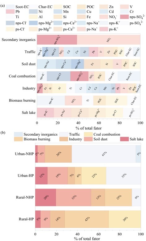 針對(duì)這一問題,中國(guó)科學(xué)院青海鹽湖研究所相關(guān)研究團(tuán)隊(duì)于2020年1月至2023年3月在柴達(dá)木盆地南部6個(gè)監(jiān)測(cè)點(diǎn)持續(xù)開展月度大氣降塵采樣。結(jié)果表明,柴達(dá)木盆地南部大氣降塵的化學(xué)組成呈現(xiàn)明顯鹽塵影響特征,鄉(xiāng)村地區(qū)鹽湖來(lái)源離子貢獻(xiàn)較高,表明鹽湖裸露地表和周邊鹽漬化土壤是區(qū)域重要自然塵源;碳質(zhì)組分分析進(jìn)一步發(fā)現(xiàn),供暖期有機(jī)碳、元素碳及char/soot比值明顯升高,反映出固體燃料燃燒排放增強(qiáng)。源解析結(jié)果顯示,非供暖期降塵主要受交通排放和土壤揚(yáng)塵影響,供暖期則主要受煤炭和生物質(zhì)燃燒影響;其中,鹽塵對(duì)鄉(xiāng)村地區(qū)非供暖期降塵貢獻(xiàn)較為顯著??傮w來(lái)看,供暖活動(dòng)不僅增強(qiáng)了碳質(zhì)組分排放,還可能通過(guò)改變局地氣象條件并疊加道路揚(yáng)塵、除冰鹽使用等人類活動(dòng),與鹽湖和土壤揚(yáng)塵共同影響區(qū)域降塵組成。