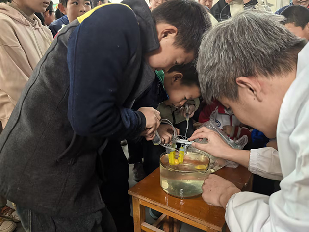 活動還精心策劃了兩場研究所前沿科學成果互動實驗,成為了點燃同學們科學熱情的“催化劑”。在“摩擦‘造’星光”實驗中,隨著材料的摩擦、擠壓和拉伸,綻放出一道道絢麗的光芒,同學們瞪大雙眼,臉上寫滿了興奮與好奇。在“水凝膠仿生章魚觸手抓取器”實驗里,當柔軟的水凝膠抓手精準抓起漂浮的蛋黃和豆腐時,現場響起陣陣驚嘆。實驗結束后,同學們圍在科研人員身邊說,“原來科學這么有趣!”“以前覺得科學離我們很遠,現在才發(fā)現,科學藏在生活的每一個細節(jié)里。”